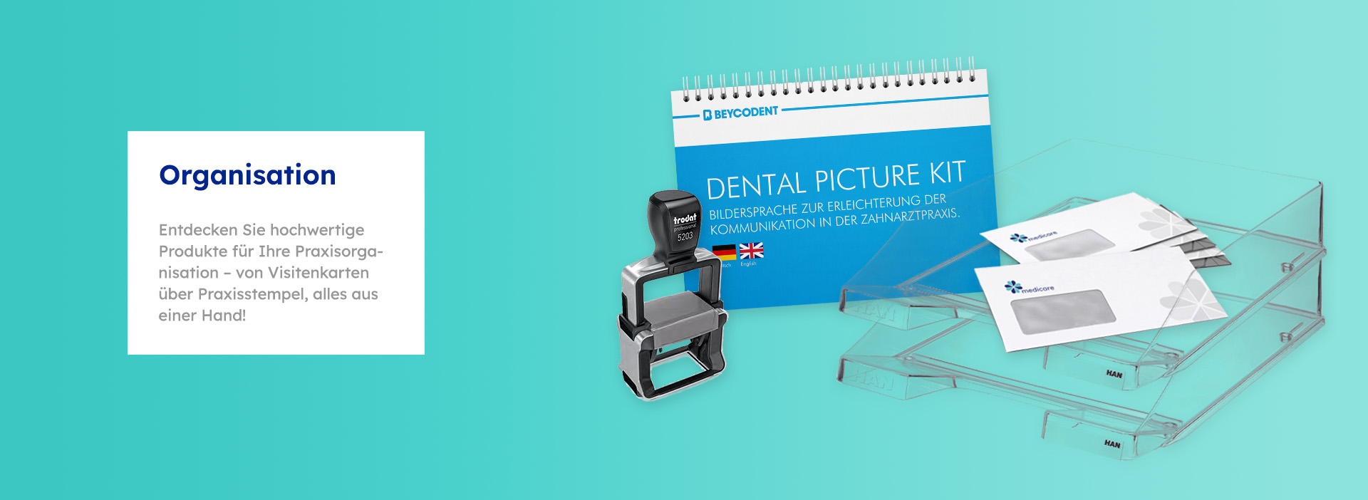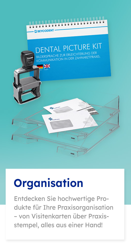 Optimieren Sie Ihre Zahnarztpraxis mit den praxisgerechten Lösungen von Beycodent. Unser Sortiment umfasst Praxisstempel, Büroartikel, Terminkärtchen, Karteisysteme, EDV-Archivmappen und Karteikästen – alles, was Sie für eine strukturierte und effiziente Praxisorganisation benötigen.