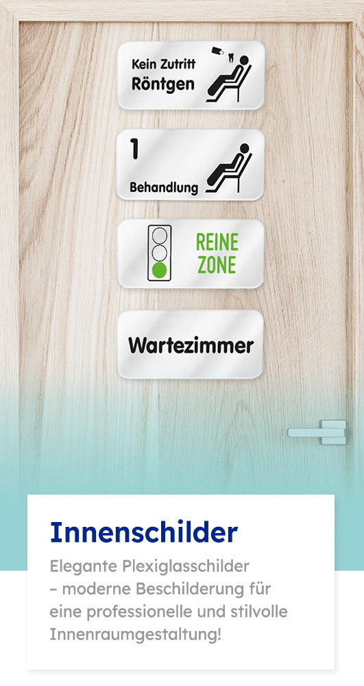 Gestalten Sie Ihre Praxis mit unseren hochwertigen Plexiglasschildern, die ganz nach Ihren Vorgaben mit Wunschtext und Motiven gefertigt werden. Mit 5 mm Materialstärke sind diese Innenschilder robust und langlebig und bieten eine elegante Möglichkeit, Besucher und Patienten zu informieren und zu leiten.Ob als Hinweisschild für Behandlungsräume, Patienten-Toilette, Garderobe oder andere Bereiche – unsere Plexiglasschilder lassen sich direkt an Wänden oder Türen aufkleben oder montieren und fügen sich dezent und professionell in Ihre Praxisumgebung ein.Produktdetails